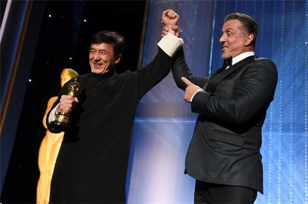 On the podium, Jackie Chan smiled at Stallone and said: "Twenty-three years ago, at Stallone’s house, I saw his statuette and couldn’t help but touch and kiss it; today Stallone is here, sitting next to me, I invited him."
